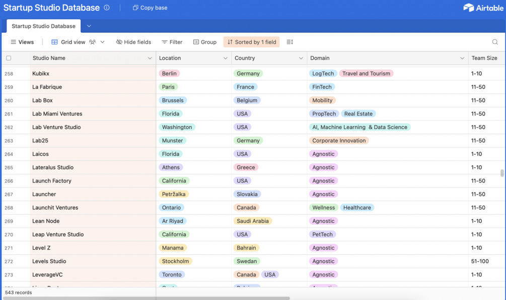 Instant access to the entire Airtable of all Startup Studios across the globe organized by location, domain, team size, and more. Lifetime access!